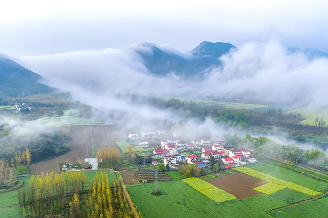 安徽省池州市贵池区殷汇镇旧溪村出现云雾美景,山峦、民居、田园等在云雾中若隐若现,宛若一幅壮丽的山水画卷,如梦似幻,宛若仙境