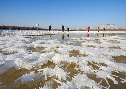 2025年1月16日,受低温天气影响,山西省运城盐湖出现冬季独特的“硝花”景观,水面上的硝花形态各异晶莹剔透,美不胜收。