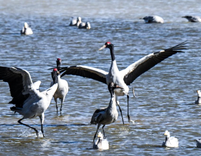 1月29日在贵州草海国家级自然保护区拍摄的越冬的黑颈鹤等鸟类。冬日,地处贵州省毕节市威宁县的草海国家级自然保护区呈现万鸟翔集的生态美景,黑颈鹤、灰鹤以及斑头雁等大批候鸟来此越冬。