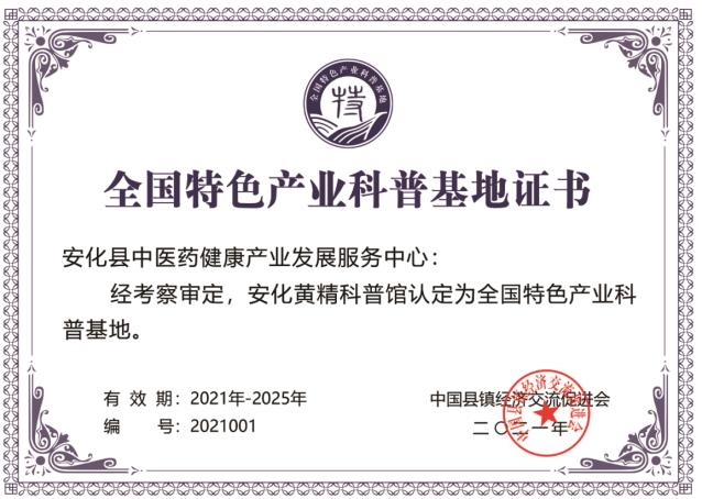经过多年的发展,安化县获评“湖南省中药材种植基地示范县”“中国多花黄精之乡”称号,“安化黄精”获国家农产品地理标志登记、注册国家地理标志证明商标,安化黄精科普馆获评“全国特色产业科普基地”,《安化黄精九制传统技艺》通过县、市两级非物质文化遗产评审,首家安化黄精宴形象专店已正式营业,研发推广黄精药膳25道。