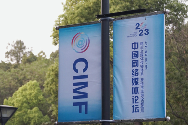 南京紫金山庄内,2023中国网络媒体论坛的道旗随处可见。(摄影吕倩媛)
