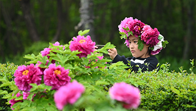山东省菏泽市曹州牡丹园内的牡丹花尽情绽放,雍容娇艳的牡丹大如玉盘,白的似雪、粉的若霞,千姿百态、雍容娇艳,吸引八方游客赏花游玩,勾勒出春日里的别样景致。