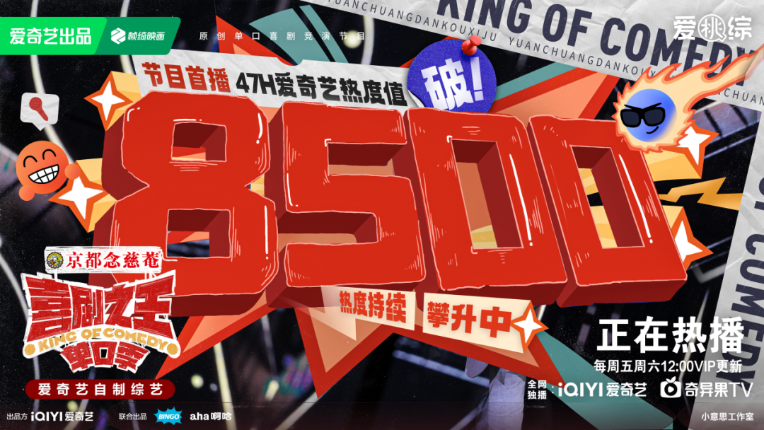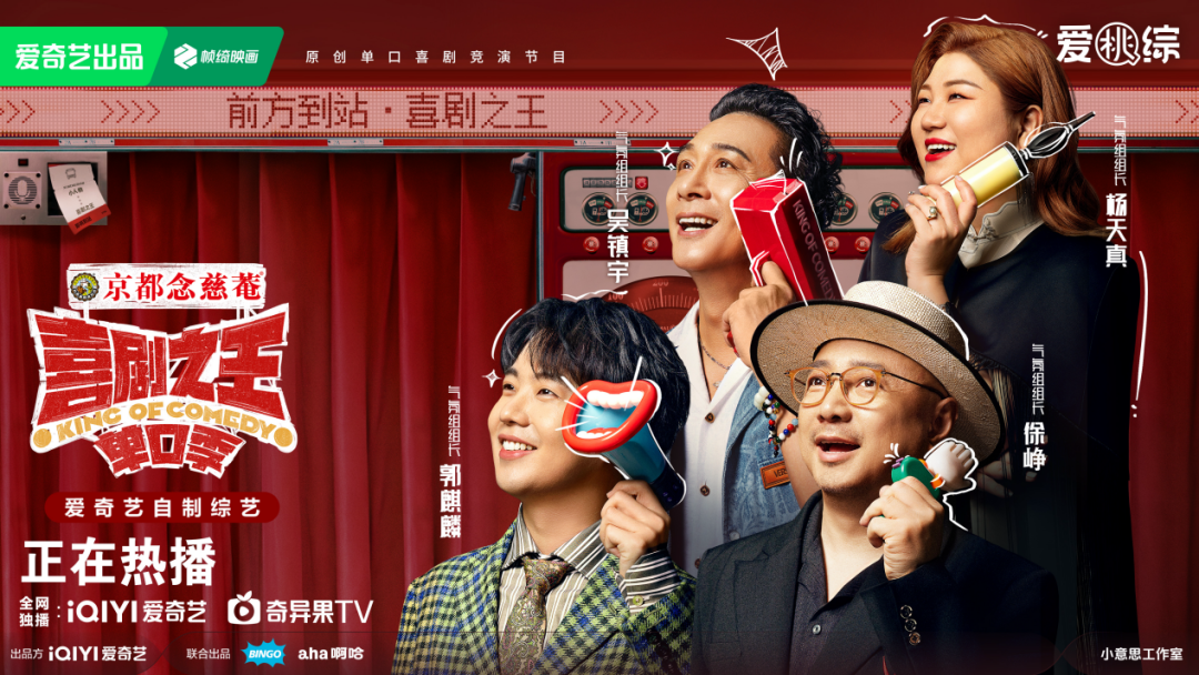 “北京大视听”重点网络综艺《喜剧之王单口季》,已于8月16日正式开播。节目由爱奇艺出品,郭麒麟、吴镇宇、徐峥、杨天真担任气氛组组长,蒋龙担任气氛组组员,而庞博、王建国、杨笠、周奇墨以“喜剧老友”身份参与,帮助44组选手在单口喜剧的舞台实现“从小人物到喜剧之王”的蜕变成长。节目首播上线,爱奇艺热度值破8500,演员及其金句话题轮番登上各大社交平台热搜,引发网友广泛讨论,在喜综爱好者之间掀起了一场大型造梗狂欢。