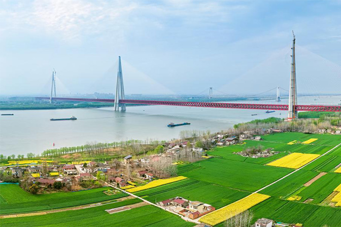 长江安徽省马鞍山市当涂县段,江边上往来穿梭的船舶与生态岸线、建设中的巢马城际马鞍山公铁大桥构成一幅生机勃勃的春日图景