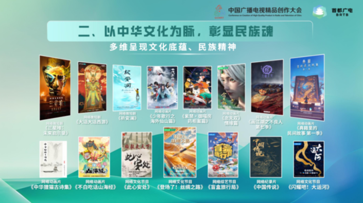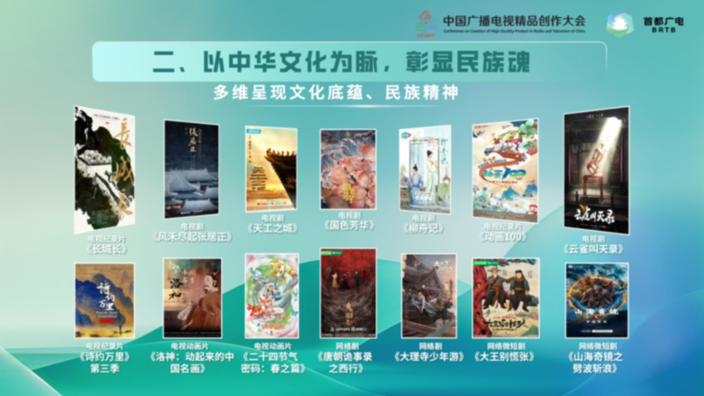 电视纪录片《长城长》多层次展现长城文化底蕴、民族精神,多维度发掘长城历史之源、建筑之美,多视角呈现长城独特风貌、人文故事,为北京段长城留下了珍贵的时代影像;电视剧《云雀叫天录》通过讲述京剧艺术家的一生,描绘出一幅波澜壮阔的梨园画卷,展现中华民族的精神内涵;电视动画片《洛神:动起来的中国名画》改编自《洛神赋》等古代浪漫主义诗歌,展现中华优秀传统文化的独特魅力;网络微短剧《三星堆:未来启示录》以三星堆文化为背景,运用AIGC技术为传统文化传播注入新的活力;网络文化节目《闪耀吧!大运河》从北京启航,联动大运河沿线八省(市),沉浸式描绘古今运河的美丽画卷,深度挖掘大运河的历史价值与现实意义。