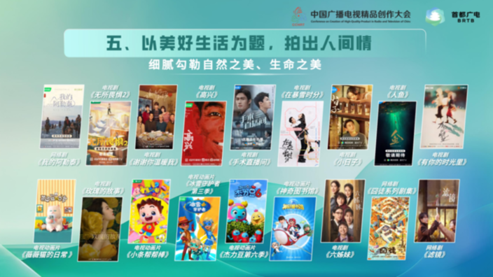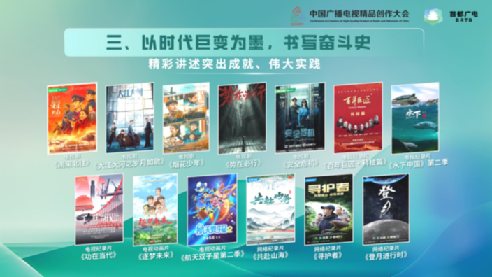 电视剧《南来北往》聚焦两代铁路公安薪火传承的故事,折射出改革开放以来中国铁路运输的巨大成就;电视剧《势在必行》深入表现近年来国家在反腐扫黑斗争中取得的显著成果;电视纪录片《功在当代》聚焦近十年国内重大工程项目,展现大型工程增进民生福祉、筑梦万家灯火的突出成效;网络纪录片《登月进行时》通过讲述中国航天人的群像故事,弘扬追逐梦想、勇于探索、协同攻坚、合作共赢的探月精神。
