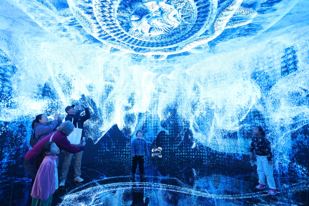 这次展出呈现了藻井雕饰中“龙凤腾云”“亭台楼阁”“银河天宫”的形象。得益于CAVE空间和裸眼3D技术,抬头仰望间,仿佛转眼置身于银河之中,又或是下一秒就要和龙、凤来一场面对面的交流……