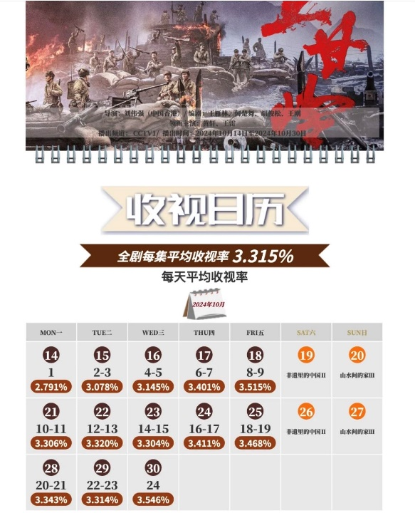 从10月14日(上甘岭战役开始72周年纪念日)开播,到30日第一轮播出结束,CVB数据中《上甘岭》全剧每集平均收视率为3.315%,大结局收视率达到3.546%,在央视一套的收视份额高达14.5%;索福瑞平均收视1.24,酷云最高收视率达到2.939,均暂居2024年收视率第一。