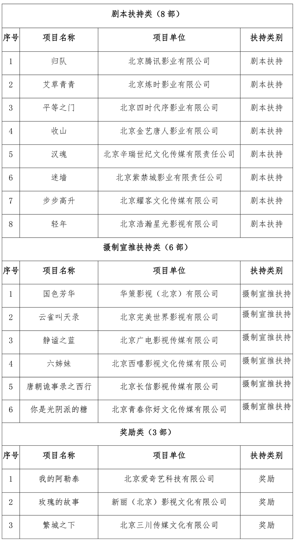 一、电视剧、网络剧拟扶持及奖励作品名单