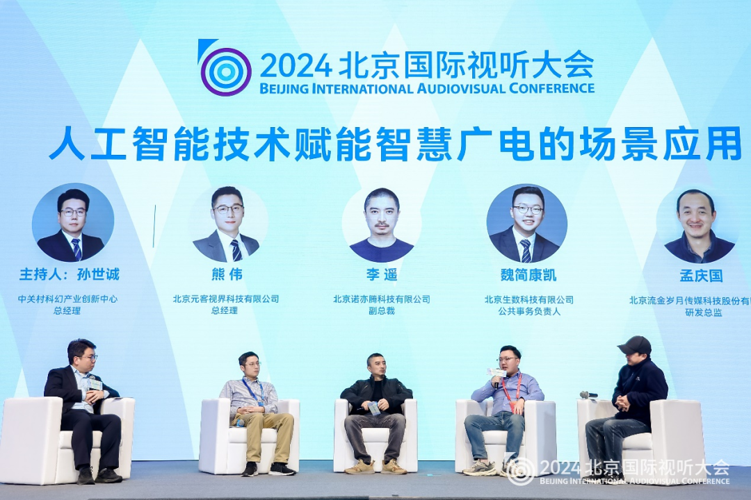 圆桌会议环节,北京元客视界科技有限公司总经理熊伟、北京诺亦腾科技有限公司副总裁李遥、北京生数科技有限公司公共事务负责人魏简康凯、北京流金岁月传媒科技股份有限公司研发总监孟庆国,共同围绕“人工智能等智慧广电关键技术的场景应用”展开探讨。