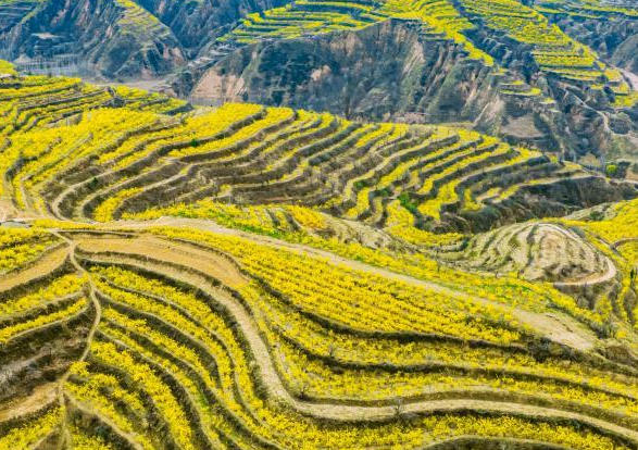 山西省运城市绛县南樊镇沸泉村千亩连翘花迎来盛花期,漫山遍野金黄璀璨,层层叠叠铺满沟壑梯田