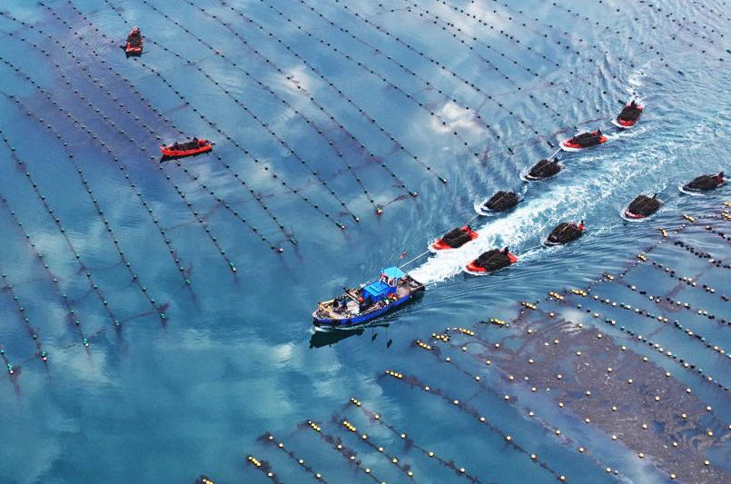 山东荣成爱伦湾海洋牧场,海面水平如镜,蓝天白云倒映其中,渔民驾驶渔船作业于"云水之间",构成一幅"渔船云中走