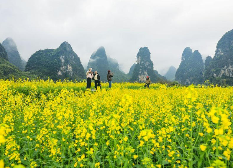 广西桂林市雁山区柘木镇东山村,连日阴雨过后,喀斯特峰林云雾缭绕、如诗如画,乡村油菜花次第盛放、金浪翻涌