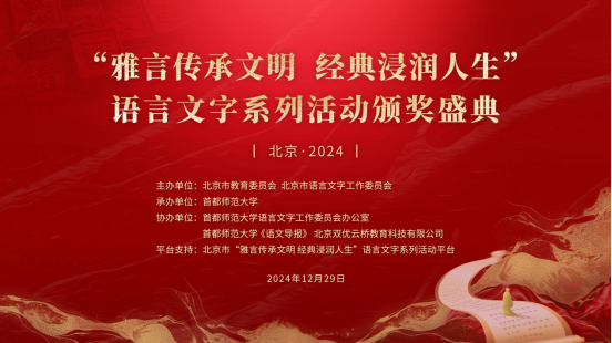 12月29日,北京市2024年“雅言传承文明经典浸润人生”语言文字系列活动颁奖盛典在首都师范大学成功举办。活动在北京市教育委员会、北京市语言文字工作委员会的指导下,由首都师范大学承办,首都师范大学语言文字工作委员会办公室、首都师范大学《语文导报》、北京双优云桥教育科技有限公司协办,北京市“雅言传承文明经典浸润人生”语言文字系列活动平台提供支持。北京市教委语言文字工作处处长、北京市语委办公室副主任杨志强,首都师范大学教务处处长、教师教育中心主任、语言文字工作委员会办公室主任王海燕,首都师范大学出版社社长高立平、副社长李佳健,首都师范大学中国书法文化研究院教授、博士生导师赵宏,北京早期教育发展促进会会长崔丽玲,以及北京市各区教委、区语委相关负责同志,各区中小学校及中等职业学校获奖学校、师生、家庭代表共计320余人现场参会。活动通过北京市“雅言传承文明经典浸润人生”语言文字系列活动平台进行了同步直播,近30000人次观看了直播。