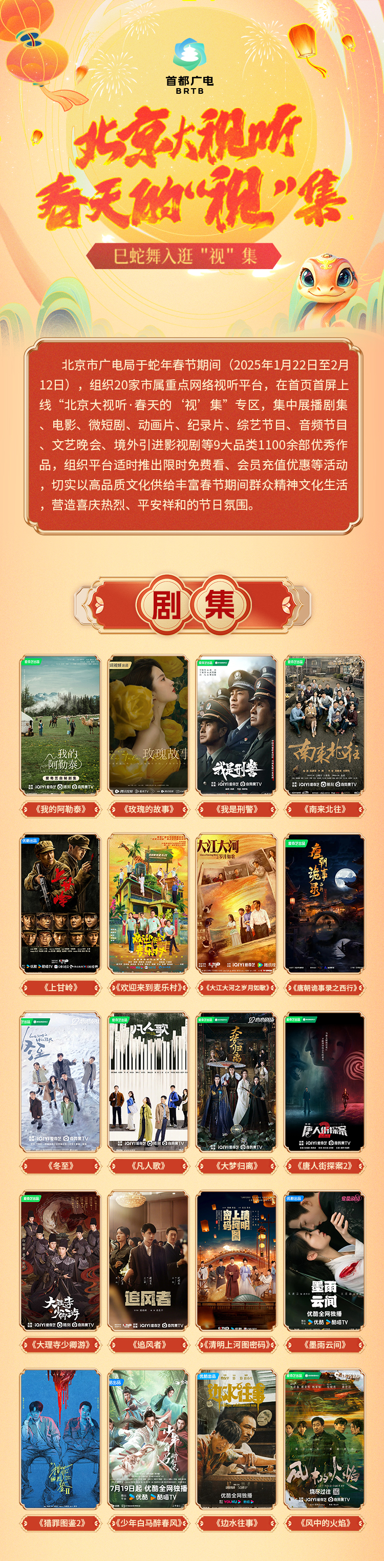 春节至,年味浓。北京市广电局组织20家重点网络视听平台,合力打造 “北京大视听·春天的‘视’集网络专区”,为市民送上了一份丰盛的文化大礼。这里汇聚9大品类1100余部优秀视听作品, 335部作品限时免费,还有众多平台开展限时免费、会员优惠活动。市民足不出户,只需轻点屏幕,便能在 “云端” 畅游文化海洋,尽享视听乐趣,让这个春节充满文化的温度与欢乐的氛围,实乃丰富精神生活、共庆新春的绝佳方式。