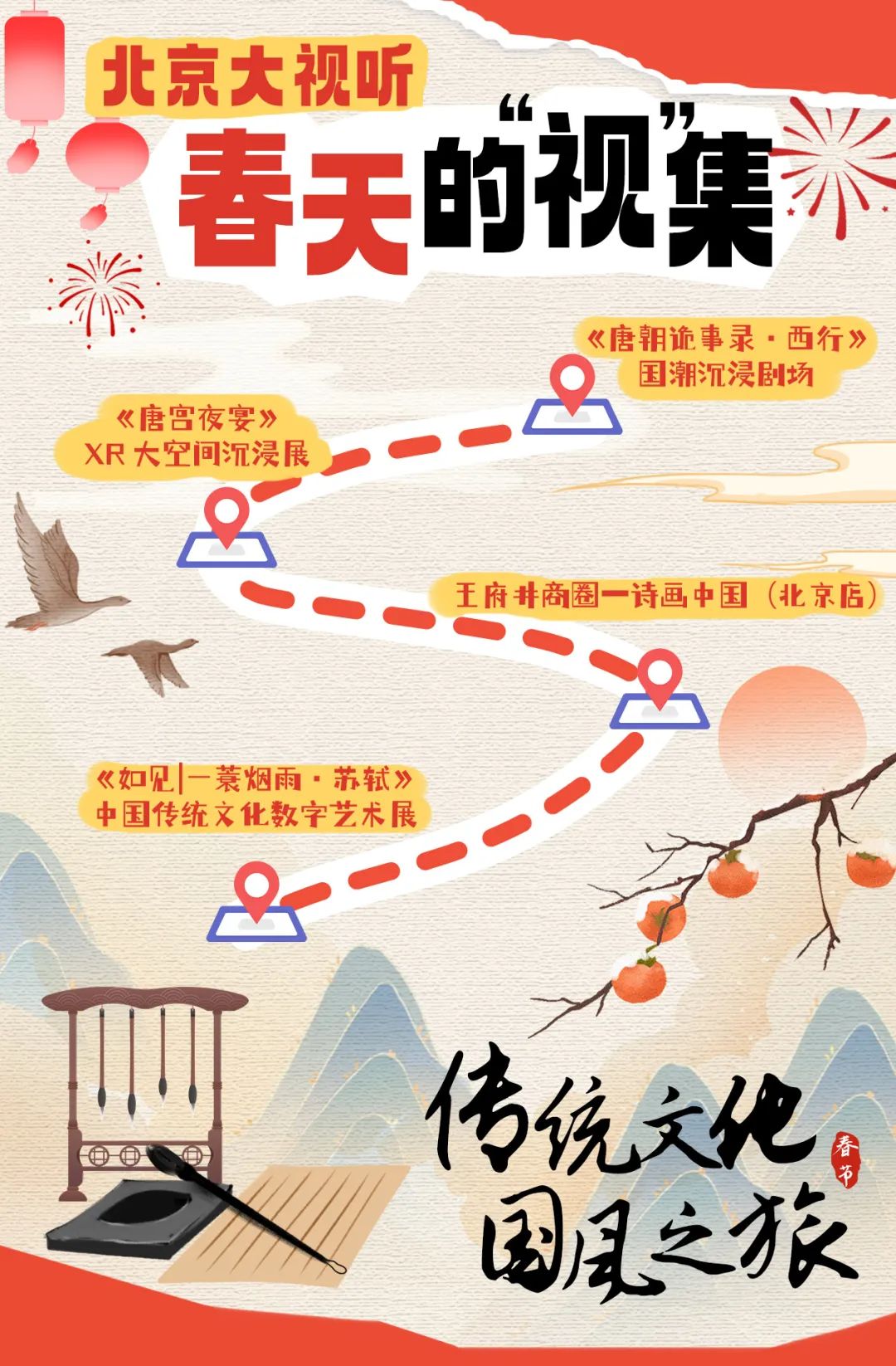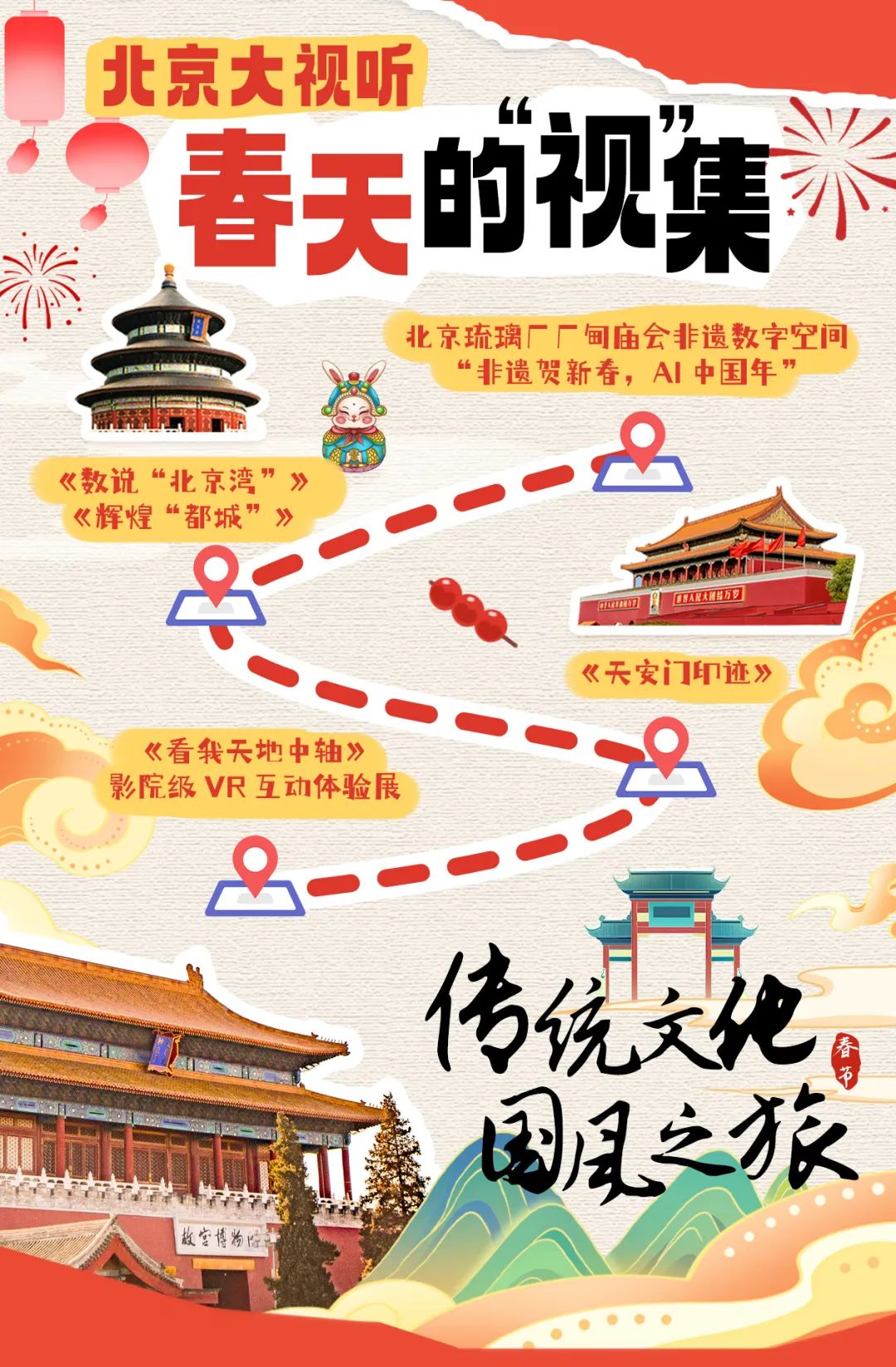 蛇年新春,北京市广电局精彩呈现“北京大视听·春天的‘视’集 —— 巳蛇舞入逛‘视’集” 春节系列活动,特别推出北京14站沉浸式体验打卡项目,将新视听、新技术、新内容、新服务进一步向城市延伸,带大家感受科技北京的魅力。今天是 大年初四,邀您一同开启传统文化国风之旅,在《唐朝诡事录·西行》国潮沉浸剧场,体验惊心动魄的冒险。 透过数字艺术与苏轼对话。感受非遗与AI碰撞的魅力 。于诗画中漫步,沉浸式邂逅《唐宫夜宴》的绝美。喜欢北京本土文化的小伙伴,还有古都特色路线。 到首都博物馆,看“北京湾”和“辉煌都城”;到天安门广场,寻觅历史的足迹。这个春节,一起探秘传统文化,玩转国风国潮吧!