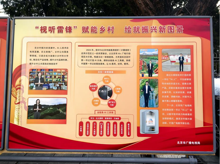 2024年,北京市在全国率先开展超高清端到端全产业链优化升级贯通试点,在门头沟区设立超高清视听(计算视听)创新应用示范区。北京数字视听公司在北京市广电局的指导和支持下,依托示范区国产算力及大模型研发优势,深入挖掘乡村振兴场景需求,相继为北京市乃至全国各地驻村第一书记打造AI分身,通过不断完善全链条“AI人”工具箱,丰富第一书记服务菜单,激活其连接小乡村与大市场、提升乡村品牌形象、优化乡村公共服务、推动农产品销售的技术优势和应用潜能,推动“AI人”成为新时代服务乡村、造福百姓的“视听雷锋”。
