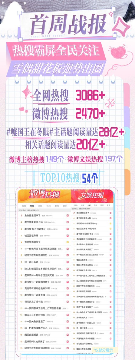 剧集开播后,社交平台迅速掀起“冰雪风暴”。全国文旅机构联动响应,观众自发参与玩梗创作,主创团队高频在线互动,推动剧集实现多维破圈传播——累计斩获全网热搜 3086次、微博热搜2470次,#嘘国王在冬眠#主话题阅读量突破28亿,衍生话题阅读量超20亿,全民热议势头强劲。
