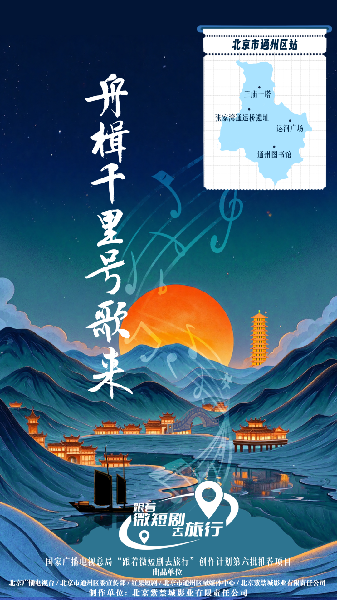 《舟楫千里号歌来》由北京广播电视台、北京市通州区委宣传部、红果短剧、北京市通州区融媒体中心、北京紫禁城影业有限责任公司出品,北京紫禁城影业有限责任公司制作,共30集,每集5分钟。取景地为北京市通州区,张家湾通运桥遗址、三庙一塔、运河广场、通州图书馆等地。讲述了音乐学院学子白佳彤与非遗传承人于本水因“船工号子”结缘的青春励志故事,展现了两代人携手传承非遗的温情与坚守,传递出运河文化的千年历史和精神内核。