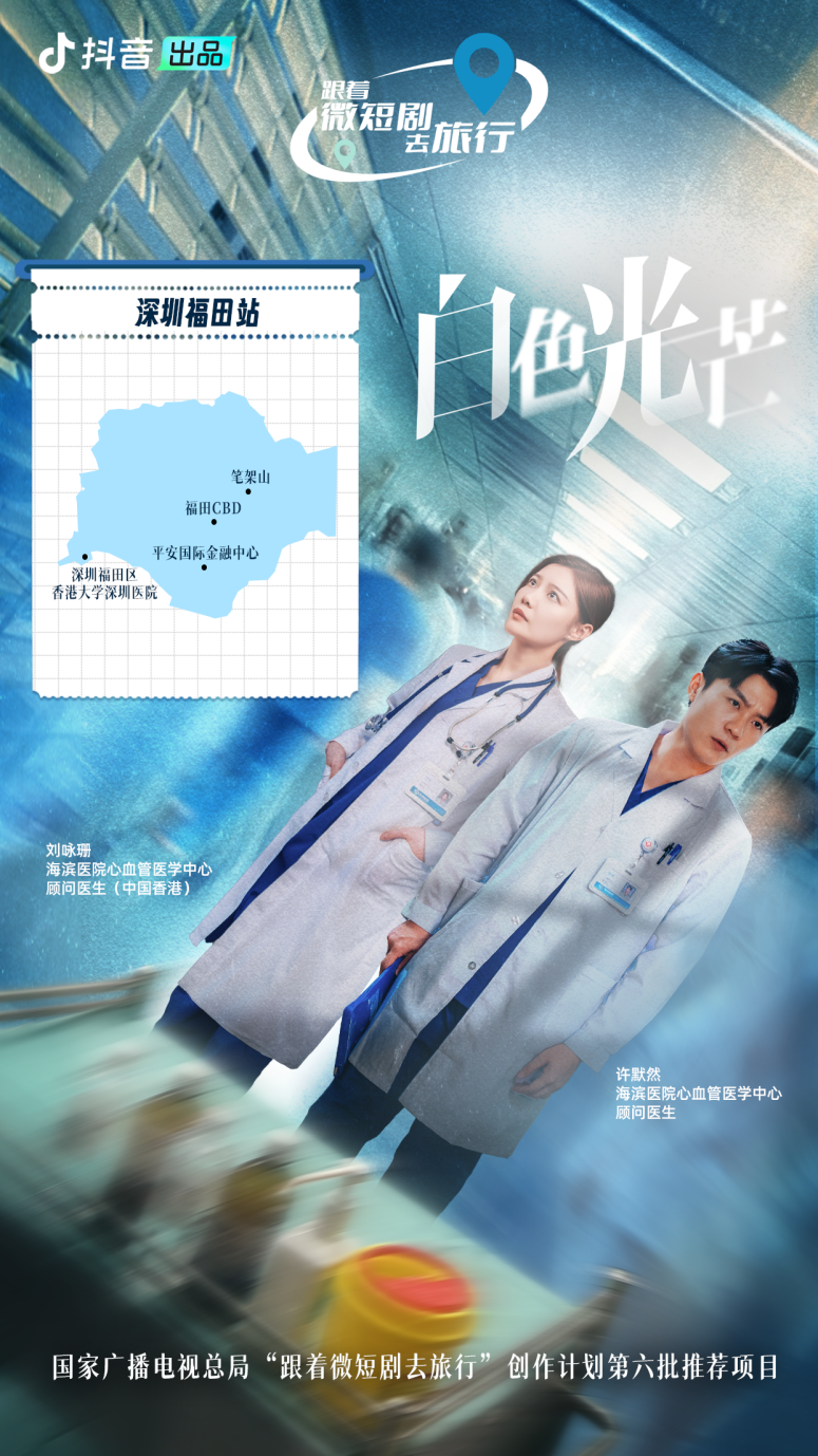 《白色光芒》由抖音出品,中广天择传媒股份有限公司,共12集,每集5分钟。取景地为深圳福田区香港大学深圳医院、福田CBD、平安国际金融中心、笔架山等,讲述来自广东的外科医生许默然与来自香港的医生刘咏珊经过一系列医疗事件,从竞争对手变成完美搭档的故事,为深港合作及粤港澳大湾区发展的重要时代提供了鲜活注脚。