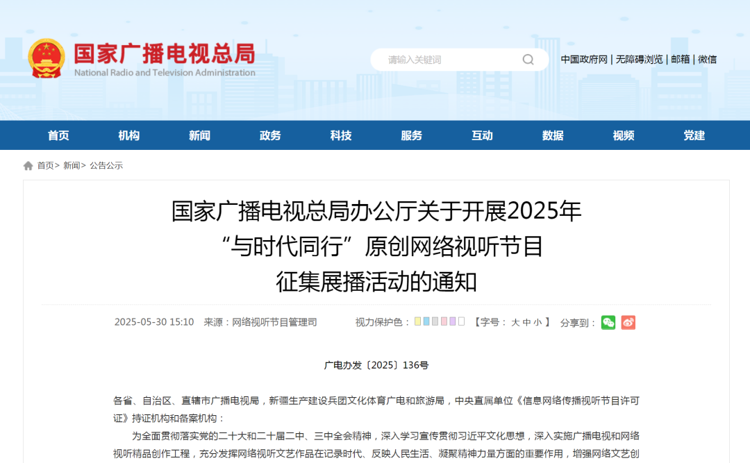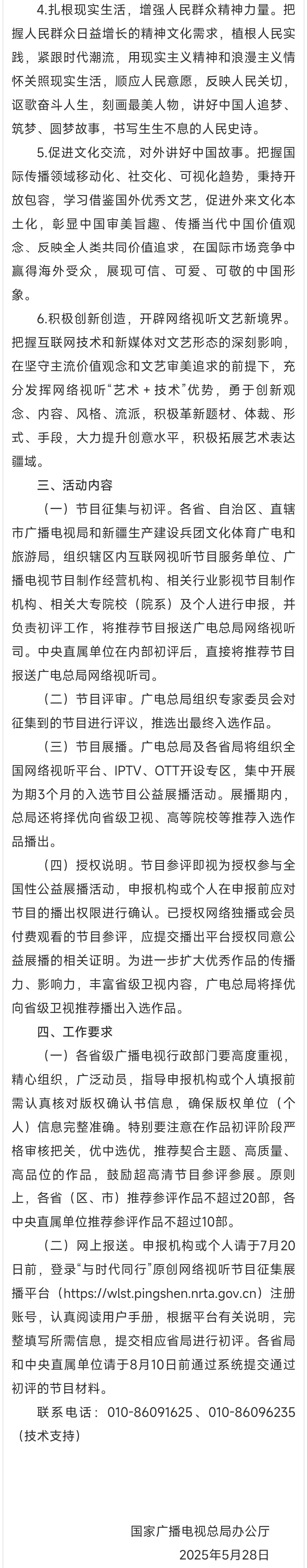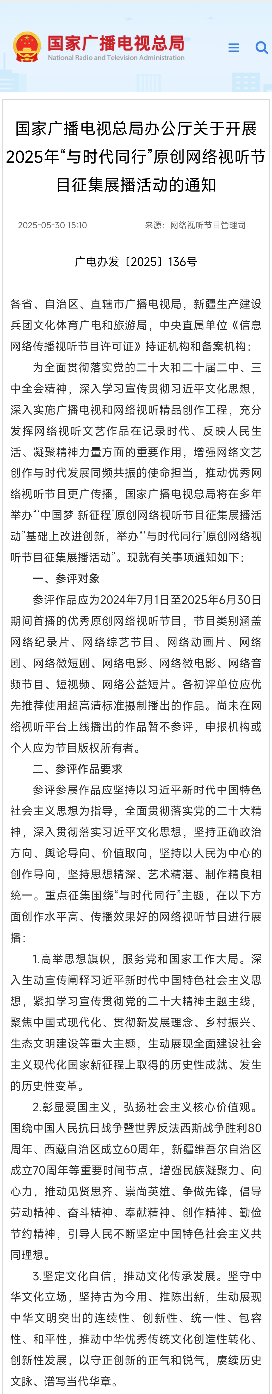 近日,国家广电总局办公厅发布《关于开展2025年“与时代同行”原创网络视听节目征集展播活动的通知》(以下简称《通知》)。