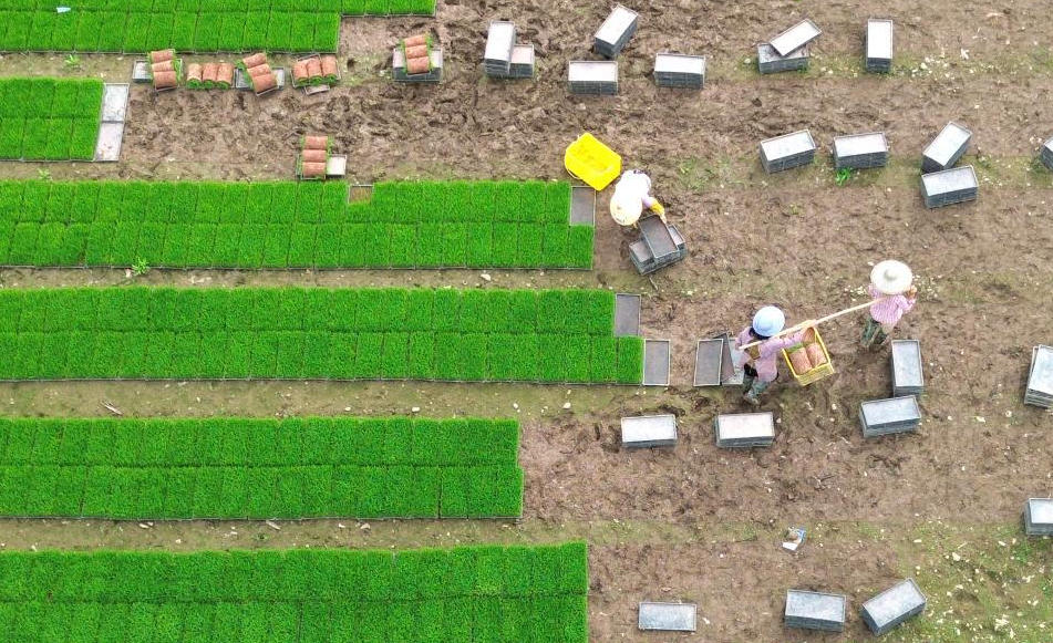 广西壮族自治区贺州市农民抢抓农时加紧早稻插秧,田间一派忙碌景象