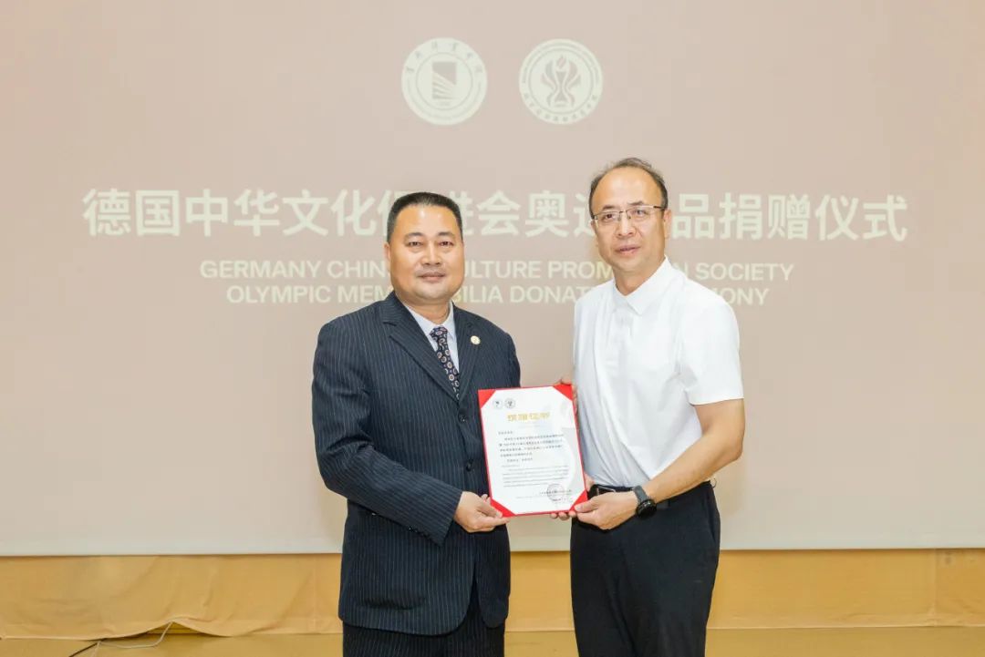 7月14日下午,德国中华文化促进会奥运藏品捐赠仪式在首都体育学院隆重举行。首都体育学院副院长左伟、德国中华文化促进会执行会长王志文等嘉宾出席活动,共同见证这批珍贵奥运藏品正式入藏首都体育学院奥林匹克教育博物馆。