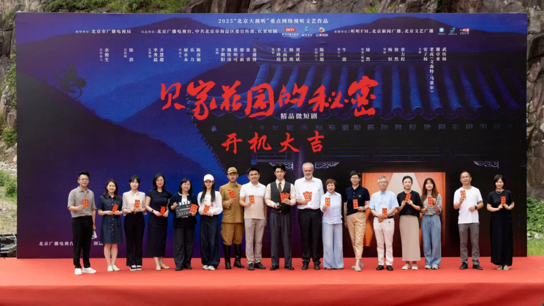 7月12日上午,“北京大视听”重点网络文艺作品——精品微短剧《贝家花园的秘密》开机仪式在浙江横店影视城举行。该剧由北京广播电视台、中共北京市海淀区委宣传部、红果短剧联合出品。其以独特的叙事视角、扣人心弦的传奇故事性备受瞩目。出品方代表、主创团队及主要演员悉数亮相,共同为这部聚焦北京抗战历史、致敬反法西斯英雄的作品揭开序幕。