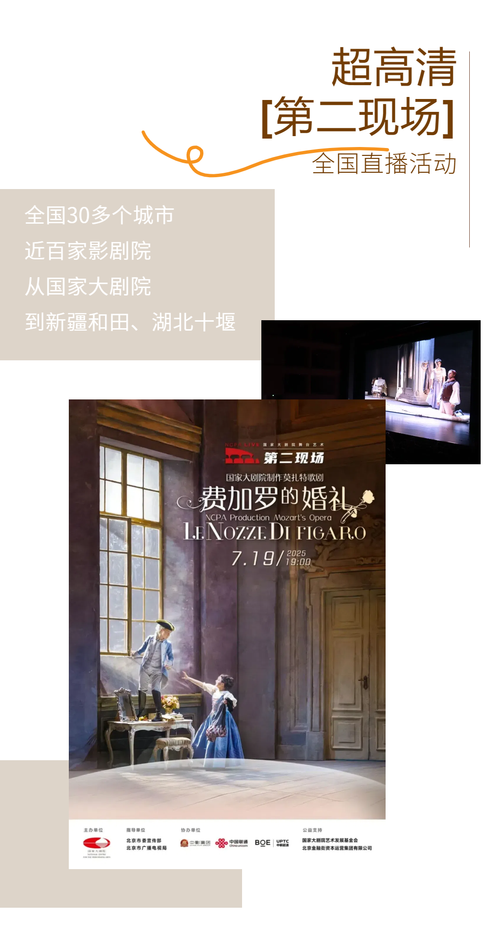 7月19日,莫扎特经典歌剧《费加罗的婚礼》通过“第二现场”以超高清4K+5.1环绕声技术同步直播至全国30多个城市的近百家影剧院。“把世界级艺术盛宴送到家门口”这一创新实践,受到了全国观众的热议和盛赞。成功的背后,蕴含着 北京市广电局以内容创新、技术革新、安全探新、场景更新、服务出新持续探索超高清技术赋能文化惠民、丰富内容生态、推动产业升级,奋力推进全国文化中心建设的不懈努力。