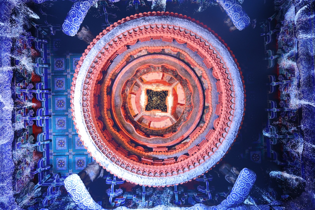 当CAVE空间作为影像载体,通过高精度扫描重建、裸眼3D等技术,中国古建筑中重要的装饰构件——藻井以超高清画质“悬浮”于空中,每一道榫卯结构、每一条藻纹肌理都纤毫毕现。