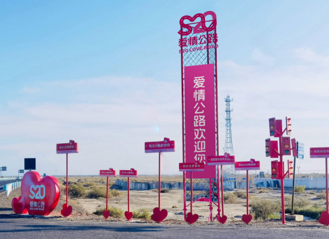 S20爱情公路,是全疆首个人文主题高速公路,作为新疆交投集团自主建设和运营的第一条高速公路项目,是新疆“6横6纵7枢纽8通道”高等级公路网中的第二横,也是由中国内地通往中亚地区的重要内陆通道,在自治区高速公路网中占据重要地位。为赋能“新高速·天山行·雪莲情”服务品牌再添新活力,新疆交投集团克拉玛依分公司结合S20沿线特色,旨在打造全疆首条文化型高速公路,描绘一幅“诗与远方”的长路画卷。以“爱”为名,连接彼此,这条公路汇集了一段段动人心弦的爱情故事,沿途设置了“爱的方向”指引幸福历程、“爱的起点”开启浪漫旅行、“爱的跨线桥”展现24节气爱情宣言、“爱情博物馆示范服务区”留下爱的印记、“动漫IP乐园示范服务区”追寻童趣时光、“爱的红绿灯”转角遇见爱……保持热爱奔赴山海,为每一位乘客开启一段浪漫的旅行体验,一路在中华传统文化与浪漫爱情氛围中穿越山海,奔赴美好。