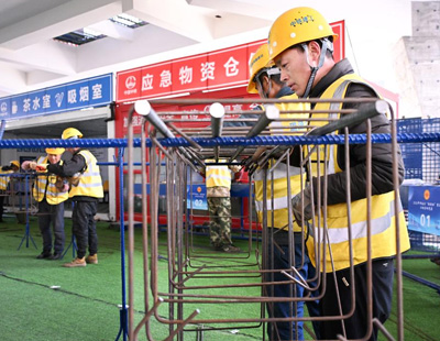 9月10日,中建一局展台的工作人员介绍老旧小区改造过程中使用附着式升降平台和外墙喷涂机器人的施工方案模型。