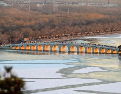颐和园十七孔桥现“金光穿洞”美景