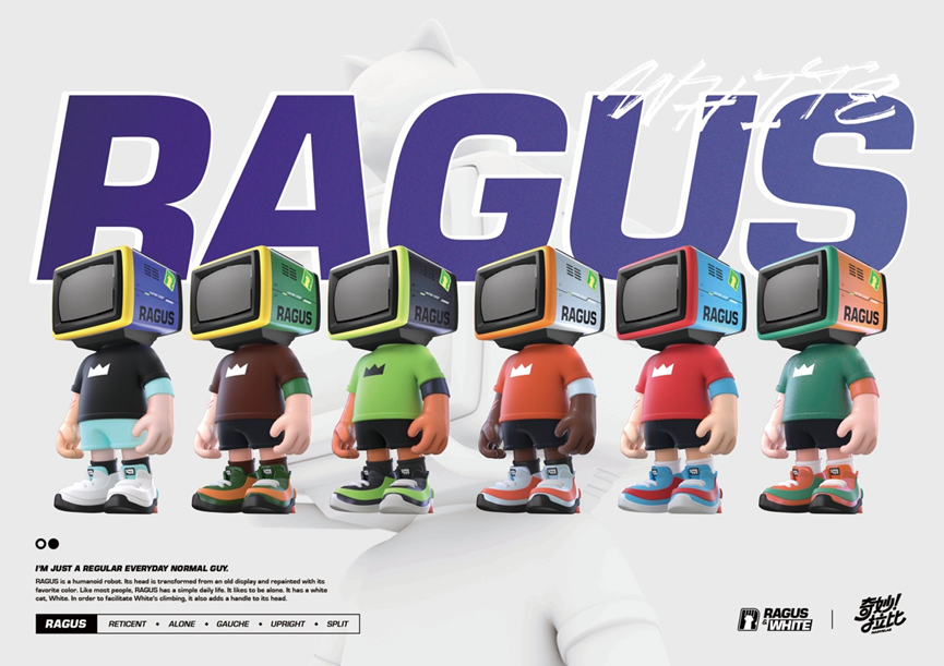 雷格斯RAGUS是一个人形机器人,头部由一台废旧显示器改造而成。他有着简单的日常,喜欢独处,养了一只名为White的白色猫咪。这样的设定让RAGUS&WHITE具有强烈的潮流属性:复古+拟人+情绪符号,而被AI赋能后的 雷格斯RAGUS可以和用户对话、表达情绪,还渐渐形成了“毒舌又有点小温暖”的人格。