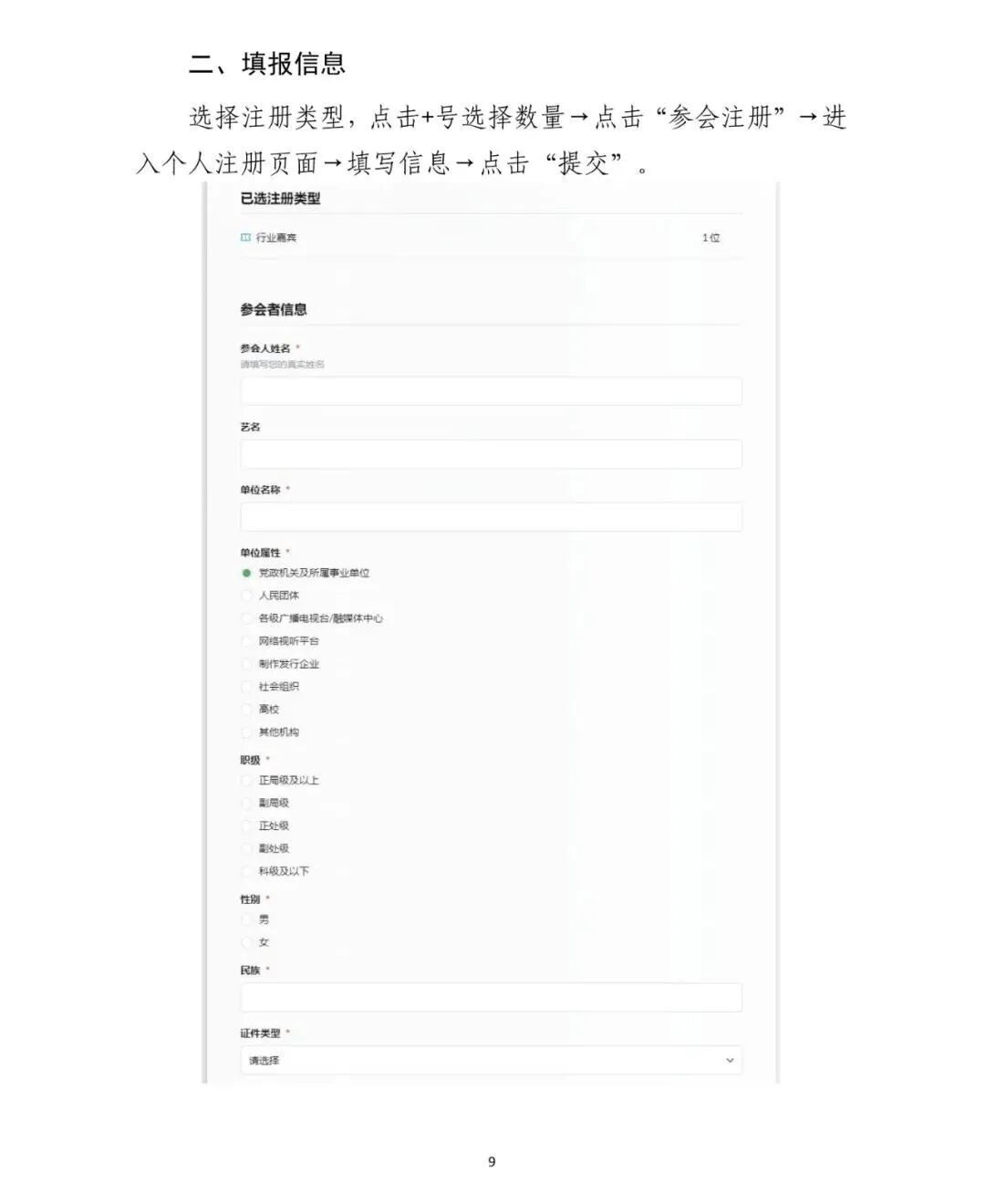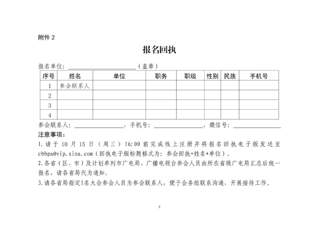 各单位请于10月15日(周三)16:00前完成报名和线上注册。各省(区、市)及计划单列市广电局、台参会人员,由所在省级广电局汇总后统一报名,请各省局代为通知,并报一名参会联系人。