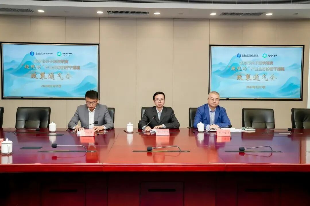 大家好!为加快超高清视听技术赋能文化旅游等产业领域融合发展,拓展多元化应用场景,积极培育“超现场”产业生态,今天,北京市经济和信息化局以及北京市广电局共同召开新闻发布会,正式发布《北京市关于加快培育“超现场”产业生态的若干措施》。我们将聚焦科技创新与产业赋能,着力突破关键核心技术、建设数字视听智控中心、打造旗舰应用场景,为北京高质量发展注入新动能。下面,我重点介绍三方面内容: