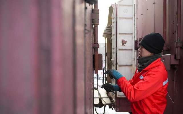 1月31日,在新疆乌鲁木齐中铁特货乌鲁木齐分公司三坪物流基地,工作人员关闭列车车厢。