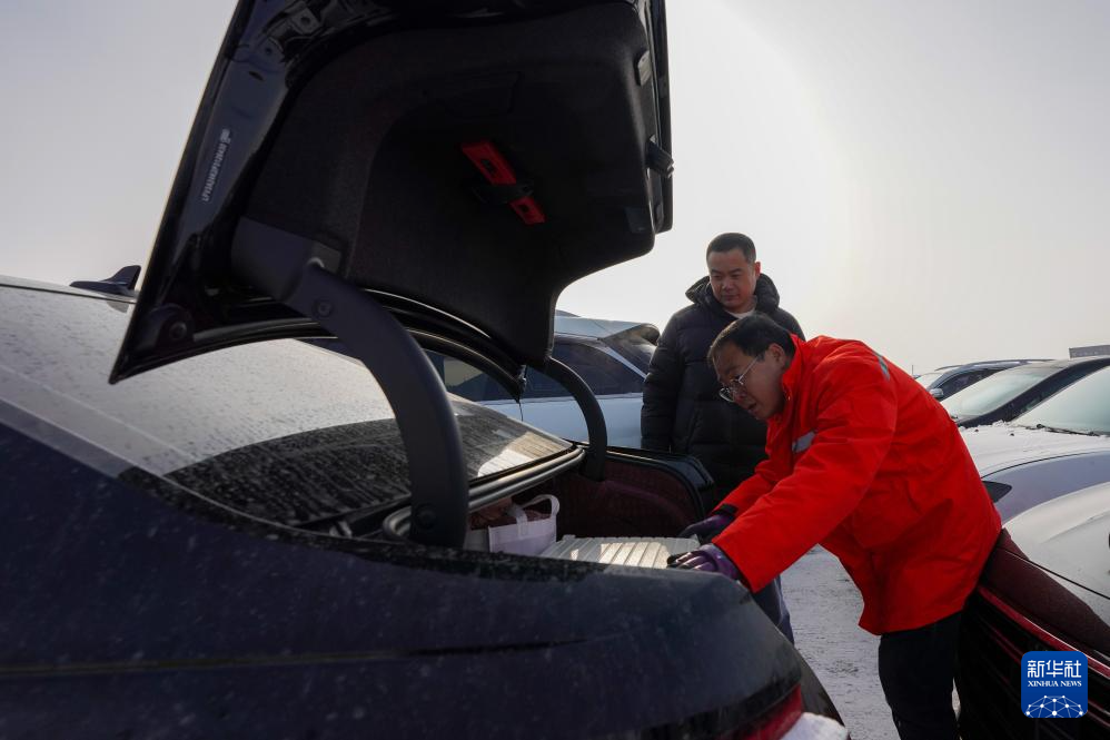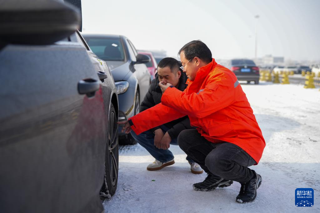 1月31日,在新疆乌鲁木齐中铁特货乌鲁木齐分公司三坪物流基地,工作人员与客户黄先生一同检查待托运车辆车况和行李。