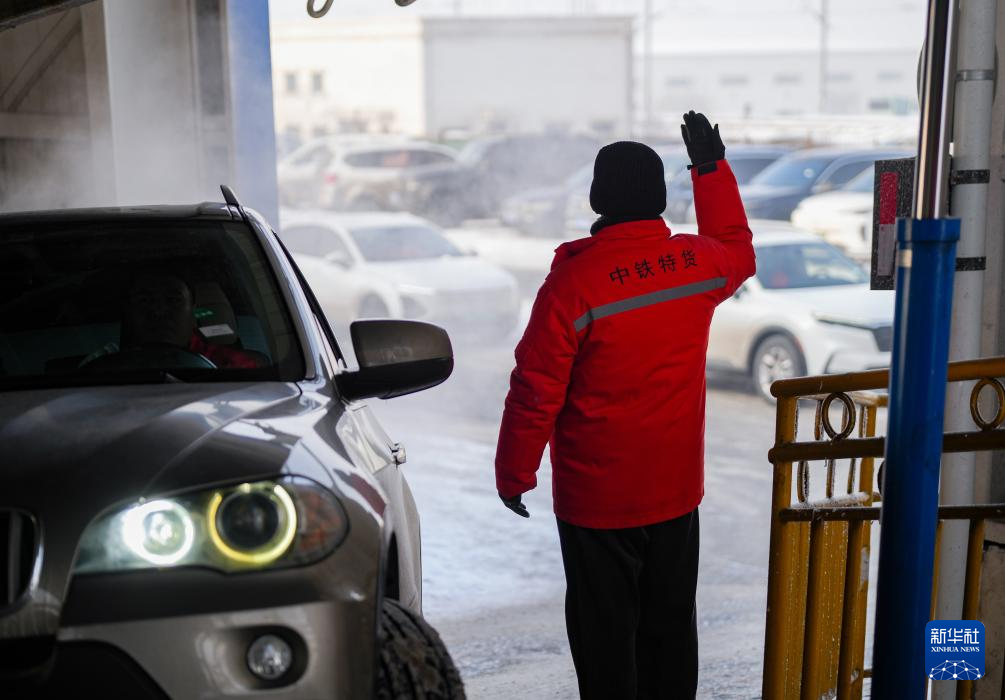 1月31日,在新疆乌鲁木齐中铁特货乌鲁木齐分公司三坪物流基地,工作人员指挥待托运车辆驶入列车。