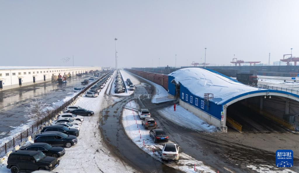1月31日,在新疆乌鲁木齐中铁特货乌鲁木齐分公司三坪物流基地,工作人员驾驶待托运车辆驶入列车(无人机照片)。