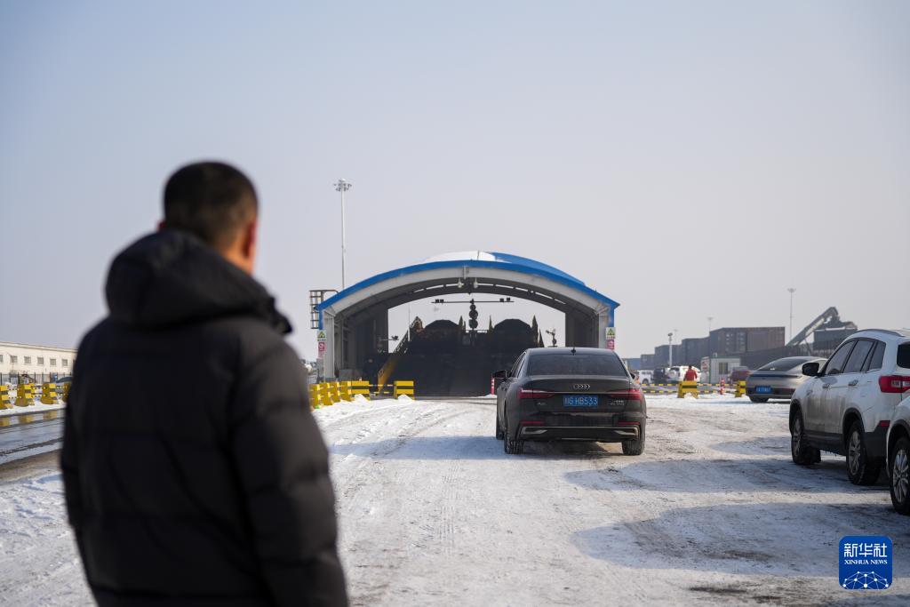 1月31日,在新疆乌鲁木齐中铁特货乌鲁木齐分公司三坪物流基地,客户黄先生目送爱车驶入列车。