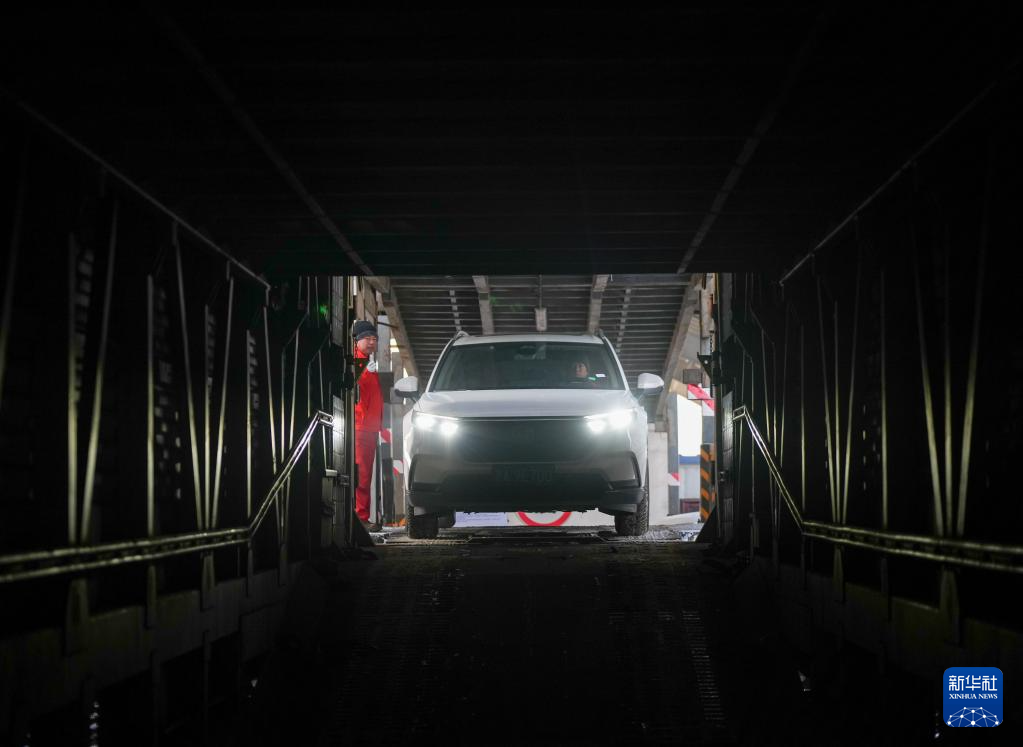 1月31日,在新疆乌鲁木齐中铁特货乌鲁木齐分公司三坪物流基地,工作人员驾驶待托运车辆在列车中行驶。