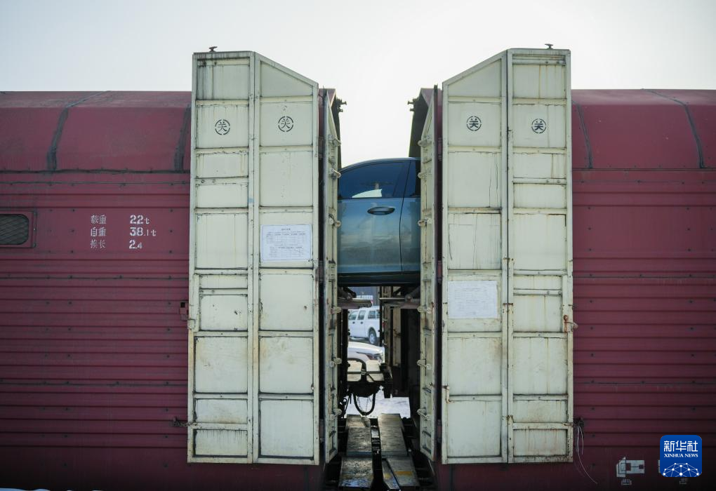 1月31日,在新疆乌鲁木齐中铁特货乌鲁木齐分公司三坪物流基地,工作人员驾驶待托运车辆驶入列车。
