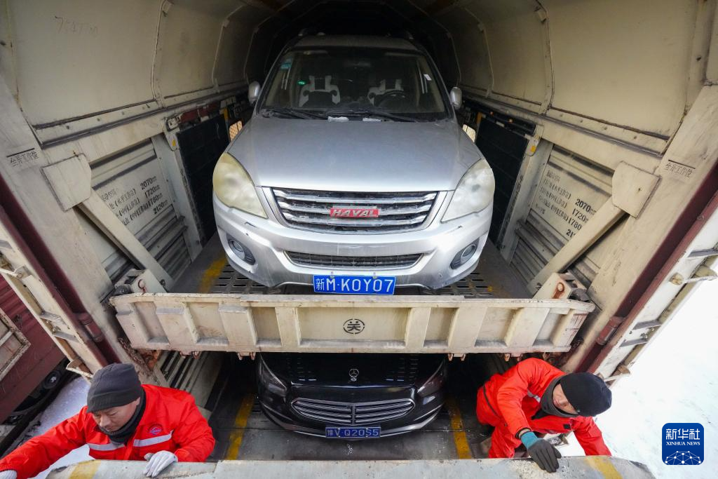 1月31日,在新疆乌鲁木齐中铁特货乌鲁木齐分公司三坪物流基地,工作人员在列车中固定待托运车辆。