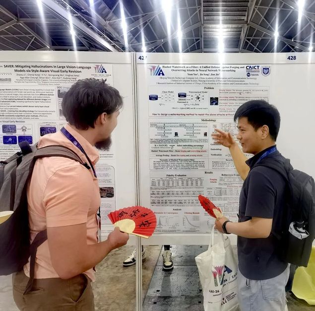 在AAAI 2026 会议现场,姚远博士通过精心设计的海报,系统展示了 NeuralMark 的技术原理、实验验证以及安全边界分析。多位与会学者和产业界专家驻足交流,并就方法设计与实际应用前景进行了深入讨论。有与会者认为该工作在思路上具有一定新意,且设计相对简洁有效,也有专家指出其在模型水印的实际落地场景中具备潜在的应用价值。