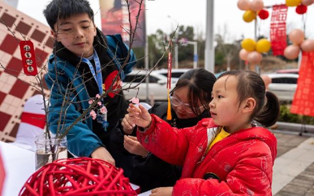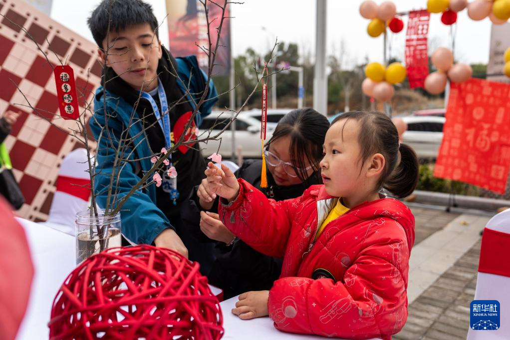 2月3日,在长沙市望城区大泽湖街道金星北路社区,小朋友参与手工梅花制作。