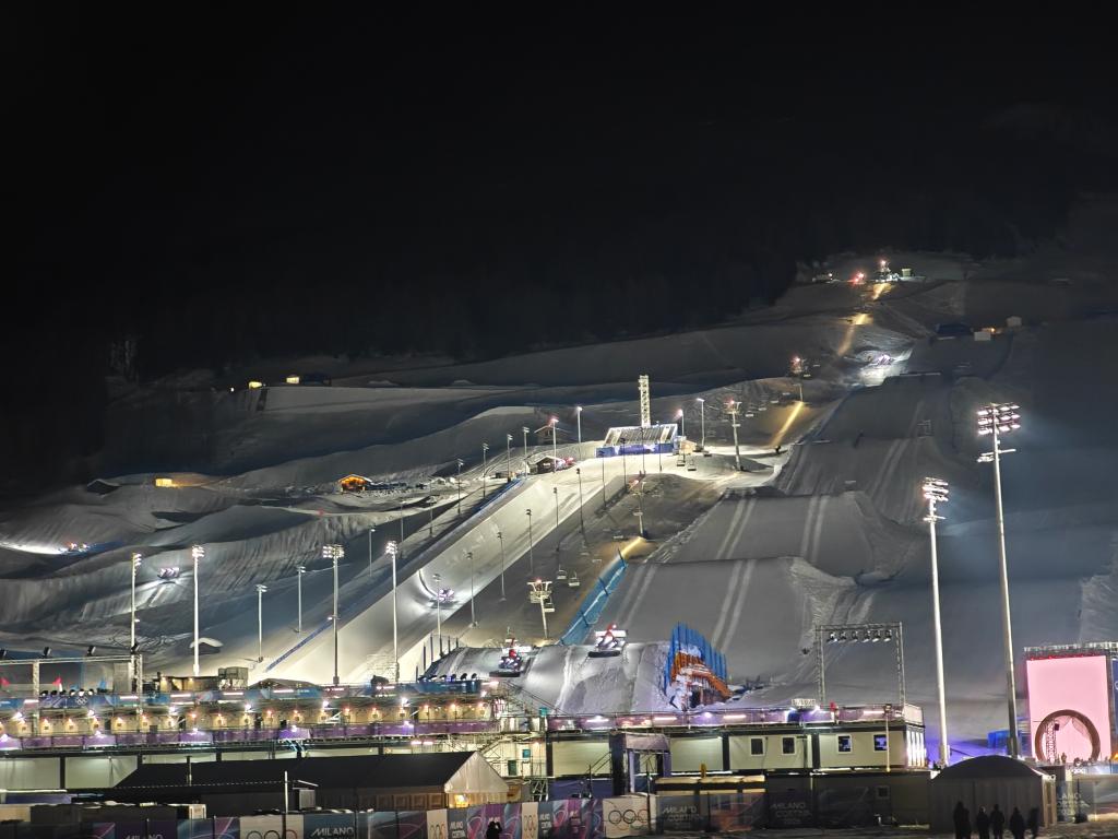2日晚的利维尼奥飘起雪花,滑雪公园灯火通明。热火朝天的场景,透着“争分夺秒”的气息。一侧,大跳台选手高高跃起,与雪花一同在空中旋转;另一侧山坡上的坡面障碍技巧、U型场地技巧和障碍追逐场地,压雪车引擎轰鸣,扬起的雪片与落下的雪花在空中交汇。
