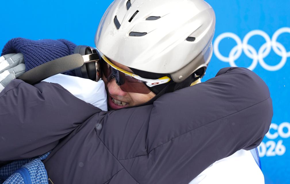 2月20日,王心迪(右)和妻子徐梦桃在比赛中拥抱。当地时间2月20日,在意大利利维尼奥举行的米兰-科尔蒂纳冬奥会自由式滑雪男子空中技巧决赛中,中国选手王心迪和李天马分获冠军和季军。新华社记者邬惠我 摄