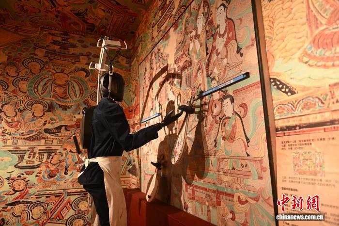 2月23日,在甘肃兰州移动机器人潮玩乐园,游人操作的机器人进行壁画修复。李亚龙 摄