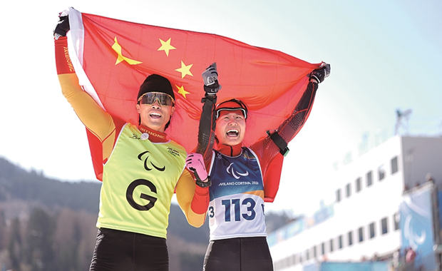 当地时间3月7日,在意大利泰塞罗举行的米兰-科尔蒂纳冬残奥会冬季两项女子短距离(视障)比赛中,中国选手王跃获得冠军。图为王跃(右)与引导员陈国铭庆祝夺冠。新华社发